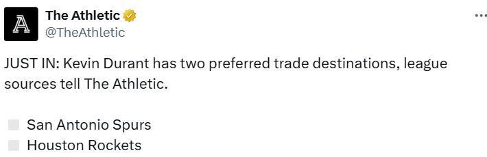 雷速体育6月15日讯 据美媒The Athletic报道,杜兰特已明确两个心仪的下家,就是马刺和火箭。